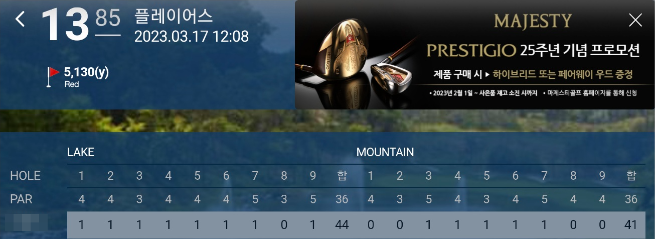 레이크코스 44타, 마운틴코스 41타로 85타+파13을 기록했다. 불행히도 단일 라운드는 실패했습니다! 다음에 방문하면 7자를 그려야겠어요.