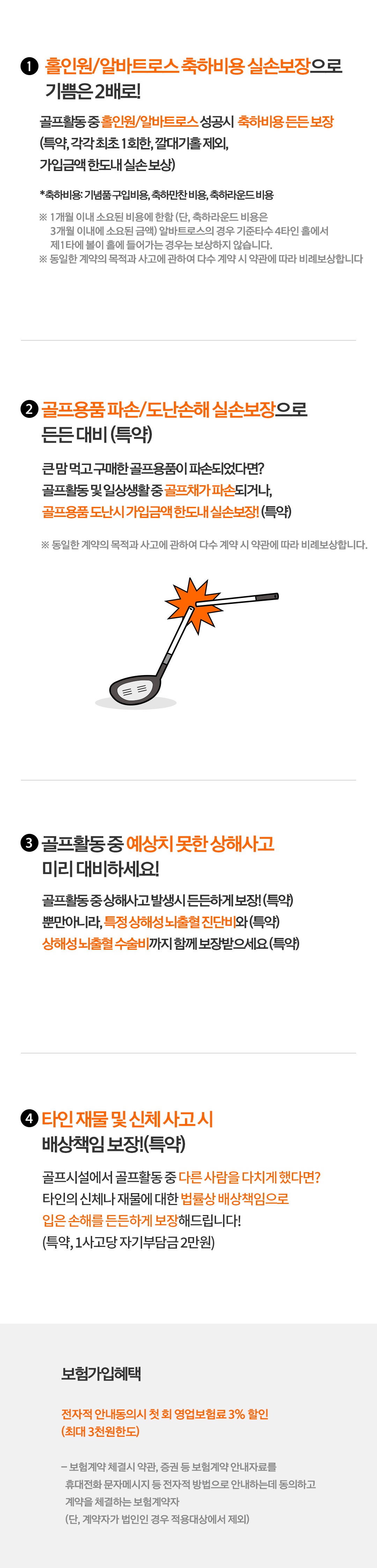 홀인원, 알바트로스, 골프 장비 손상 및 골프 활동 중 책임 약관을 통해 보상의 세부 사항을 살펴보겠습니다.홀인원 보장 특약