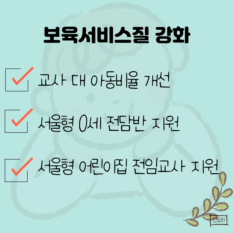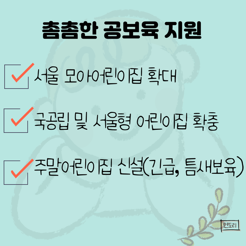 서울시는 ‘공공보육종합’, ‘보육의 질 향상’, ‘육아지원’ 3대 분야에서 모아어린이집, 어린이집 0세반 등 핵심사업을 지원한다고 한다.
